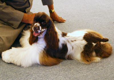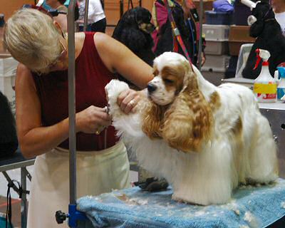 This is another shot of the dog pictured above... we thought this one was absolutely to die for! As we wandered through the big room full of Cockers, we found ourselves being drawn to the red & white partis and to the chocolates. But to each his own... there was something there for everyone.